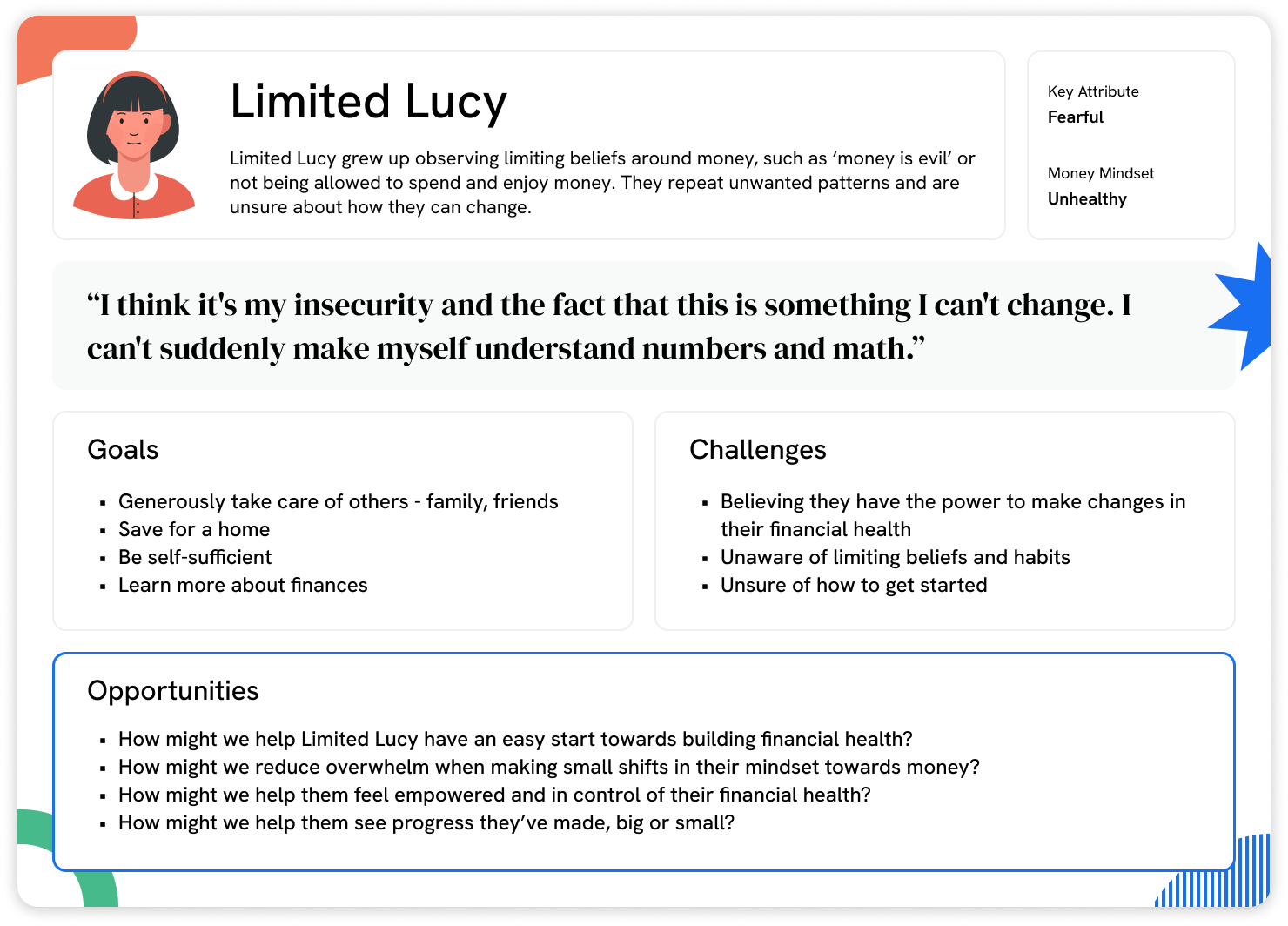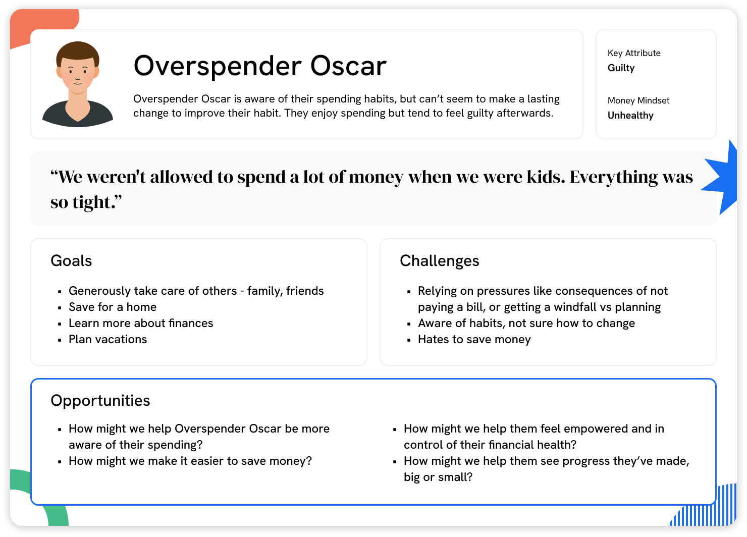Key Initiative: Nav.it's mobile app helped users improve their financial literacy through daily activities while providing a unified view of their financial health. I led foundational user research to understand users' relationships with money. Through discovery interviews and synthesis, I developed five user archetypes spanning unhealthy to healthy money mindsets. These archetypes became our north star for design decisions, helping the team prioritize problems through the lens of user empathy rather than assumptions.